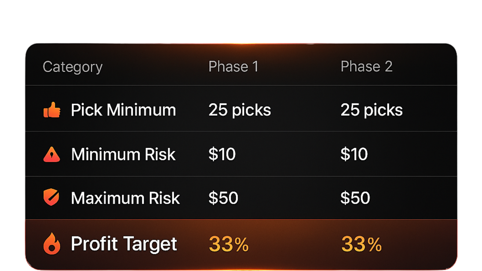 Our profit targets are among the lowest in the industry at 6-7%, making it easier for bettors to qualify for funding compared to other prop firms requiring 8% or higher.